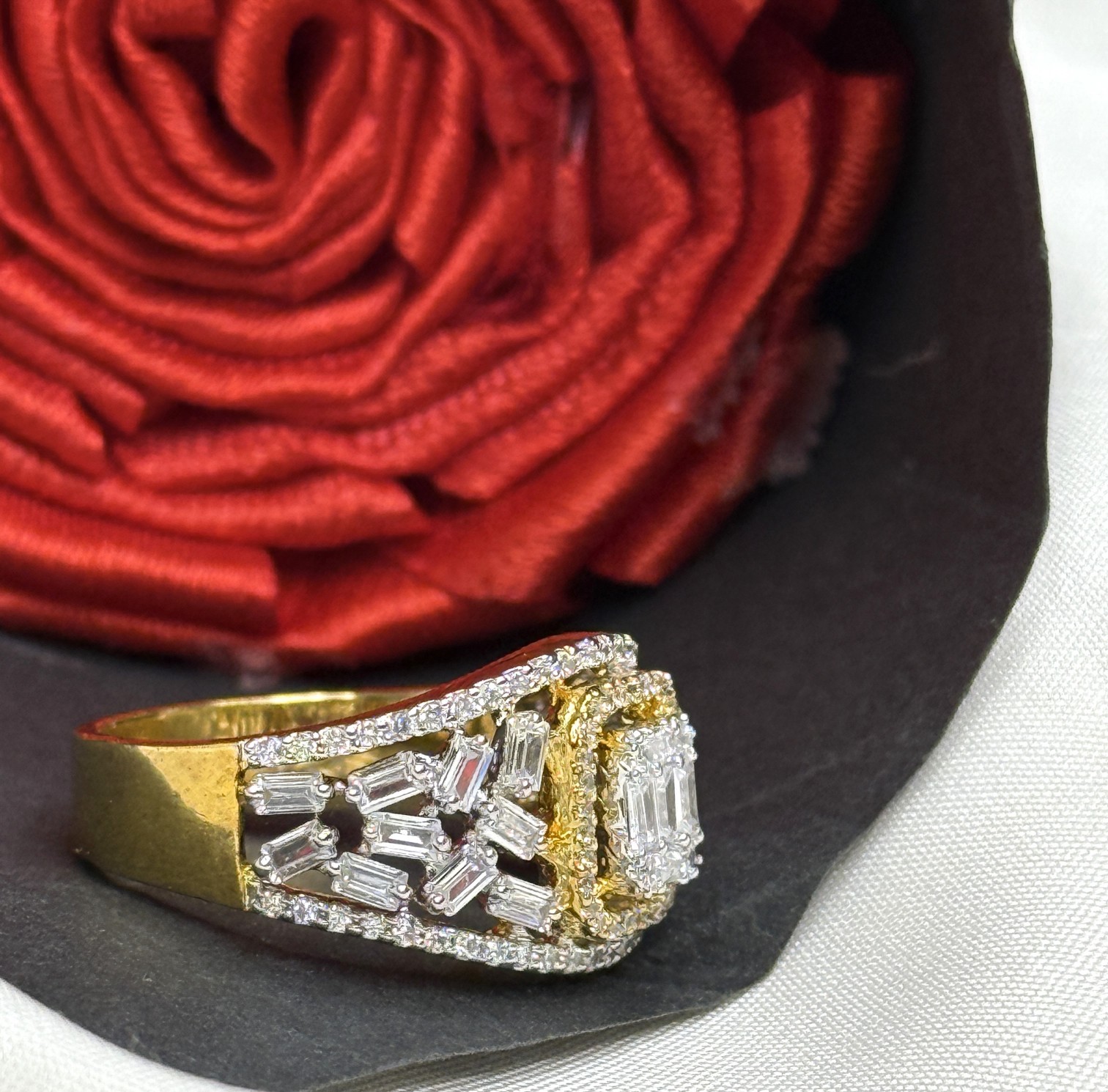What sets this designer ring apart is its fine detailing. The combination of white and yellow-toned plating offers a layered dimension that complements the central stone’s luster. The 925 Sterling Silver Emerald Cut Ring With Baguette Pressure Setting showcases a clean silhouette, allowing light to reflect perfectly through each cut stone. Ideal for cocktail nights or festive occasions, it’s sure to leave a lasting impression.