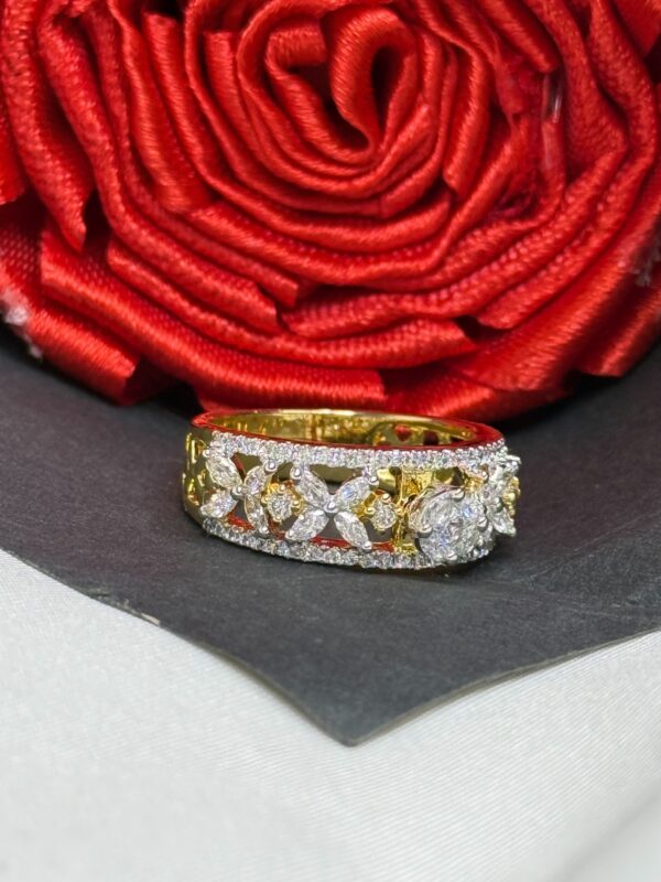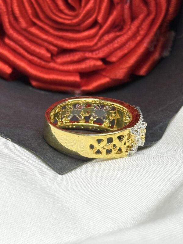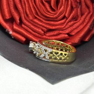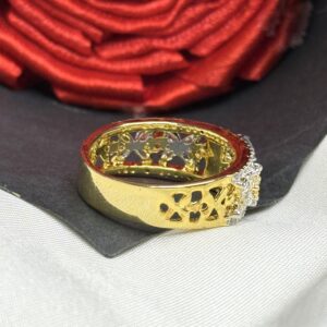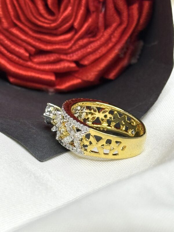 Elevate Your Jewellery Collection With This Stunning 925 Sterling Silver Ring, Crafted With A Rich Gold Finish And Adorned With A Dazzling Center Solitaire In Pressure Setting. The Band Features An Intricate Cutout Pattern And Is Embellished With A Beautiful Floral Side Design Made Of Marquise-Cut 5A Quality Cubic Zirconia, Adding Timeless Elegance And Sparkle. A Perfect Blend Of Traditional Charm And Modern Artistry, This Ring Is Ideal For Festive Occasions, Special Gifts, Or Statement Styling. Whether You’re Dressing Up For A Wedding Or Looking To Add Something Unique To Your Collection, This Ring Delivers Unmatched Brilliance And Style.