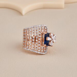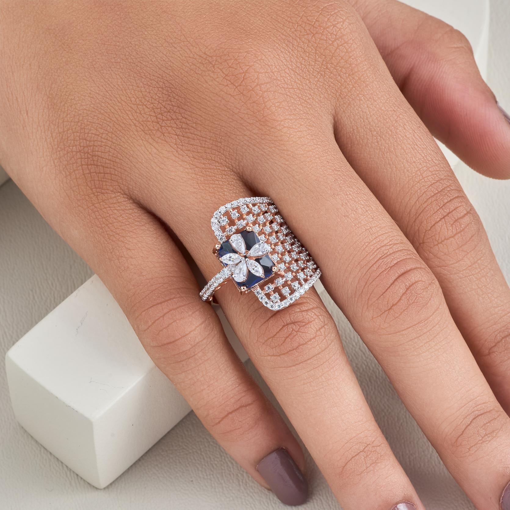 A symbol of style and confidence, the Blue Stone Cocktail Ring With CZ Floral Accent In 925 Silver & Rosegold Polish is made to mesmerize. Designed for women who love to make a striking impression, this ring features a captivating deep blue centerpiece. Moreover, a sparkling CZ floral design surrounds the center stone and enhances its charm beautifully. In addition, the sculpted grid-studded band, finished in elegant rosegold polish, adds sophisticated texture and effortlessly blends modern artistry with timeless grace.