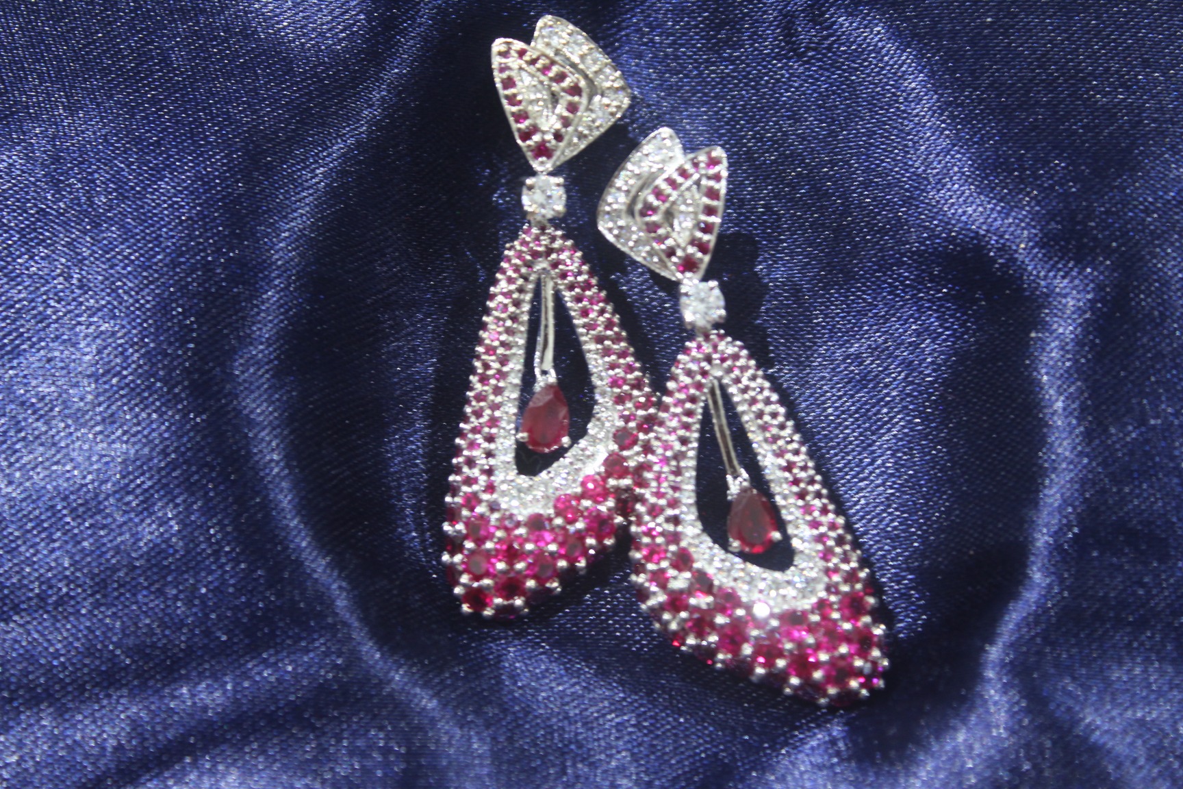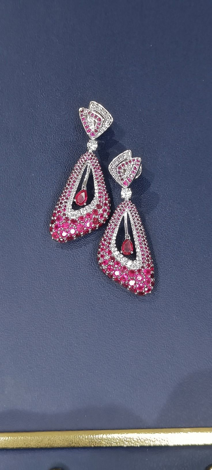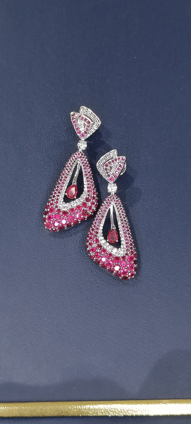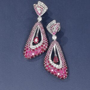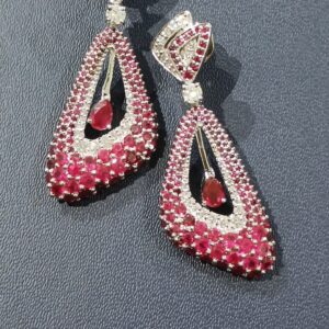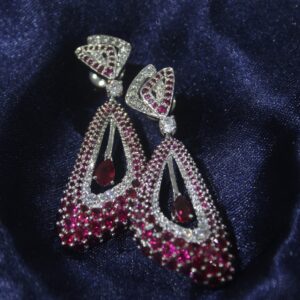 Each earring is masterfully designed to highlight the allure of fine craftsmanship — from the elegant geometric top to the cascading ruby drop center that adds fluid motion and depth. The perfect balance of crimson hues and sparkling silver lends an air of luxury, making this pair a true statement of artistry and refinement.