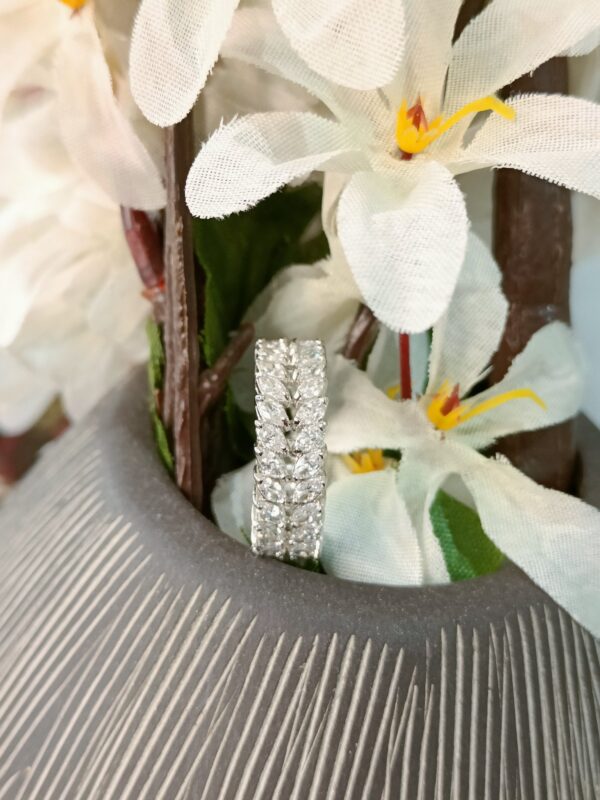 The slender, elongated shape of the marquise stones not only emphasizes the infinity symbol but also elongates the finger, creating a flattering and eye-catching silhouette.