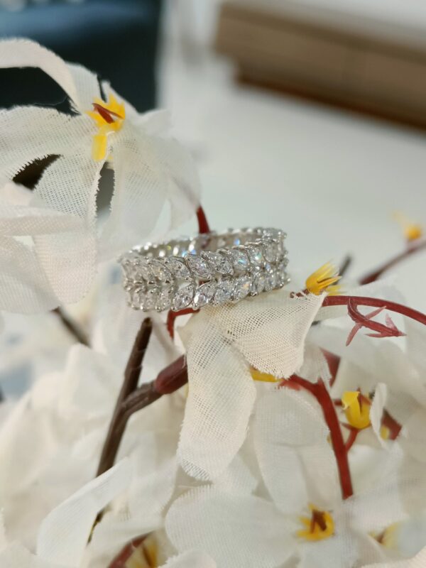 A marquise infinity band is a captivating piece of jewelry that combines the classic elegance of marquise-cut gemstones with the symbolic infinity motif. The marquise-cut stones, known for their elongated oval shape with pointed ends, are meticulously arranged to create the timeless infinity symbol. This design not only adds a touch of sophistication and grace but also carries a profound meaning of eternal love and unity.