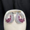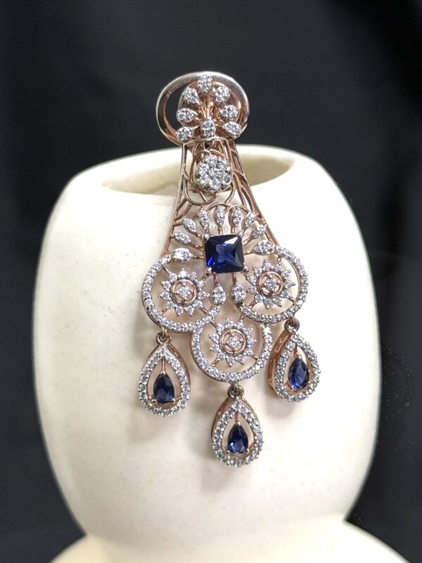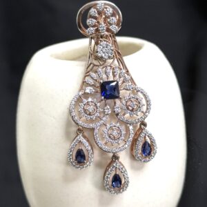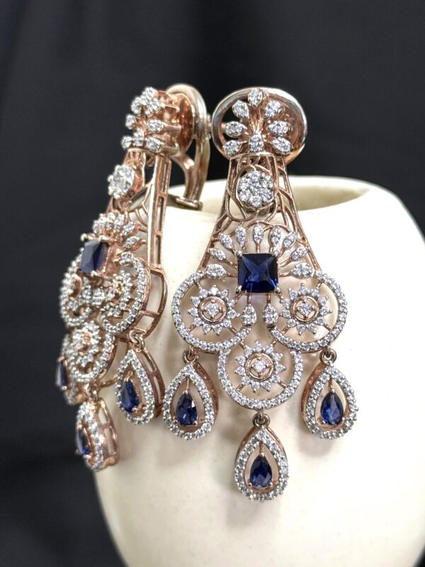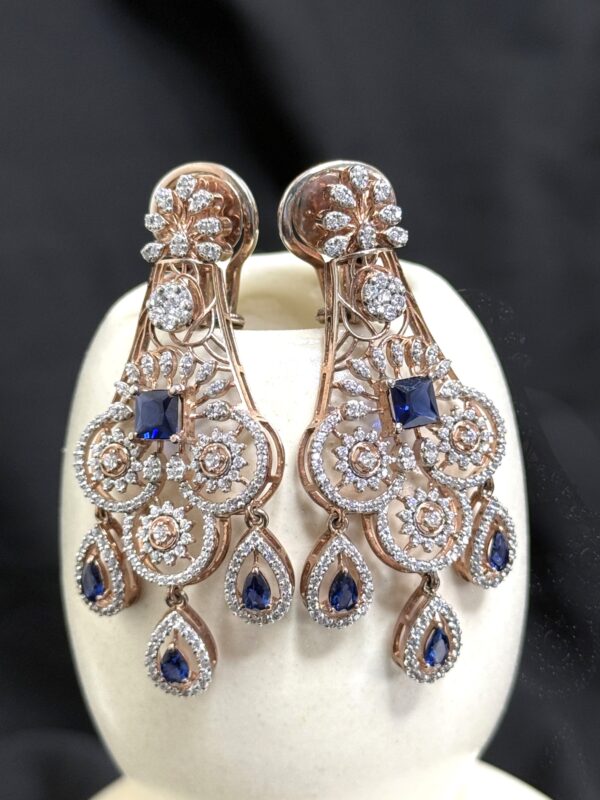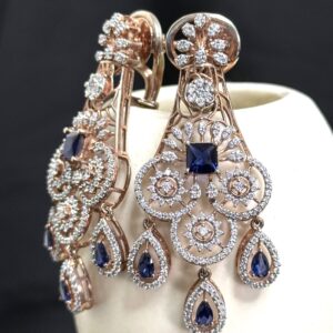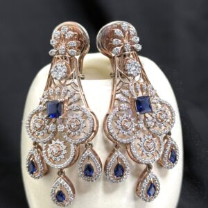 Earring in Rosegold polish crafted in 925 Hallmarked Silver studded with Finest Quality of Cubic Zirconia Diamonds & Fine quality Blue CZ Stone.
