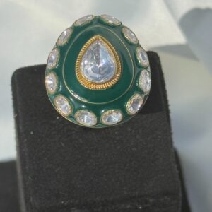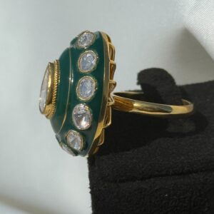 With its detailed enamel artistry and authentic Polki diamond setting. The Elegant Green Enamel Polki Ring in 925 Sterling Silver speaks to the mastery of Indian craftsmanship. The combination of uncut moissanite diamonds, green enamel, and sterling silver provides a luxurious, textured finish. Because of its comfortable fit and eye-catching silhouette, this ring can easily complement both traditional attire and modern wardrobes. Moreover, each element—from the gold-plat bezel to the enamel detailing — thoughtfully placed to enhance balance and brilliance. This makes it not only visually appealing but also emotionally captivating.