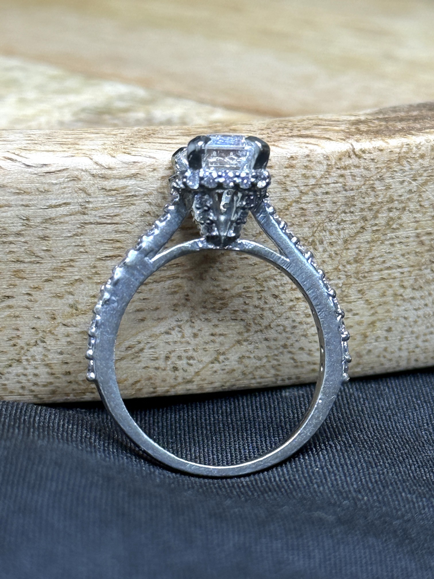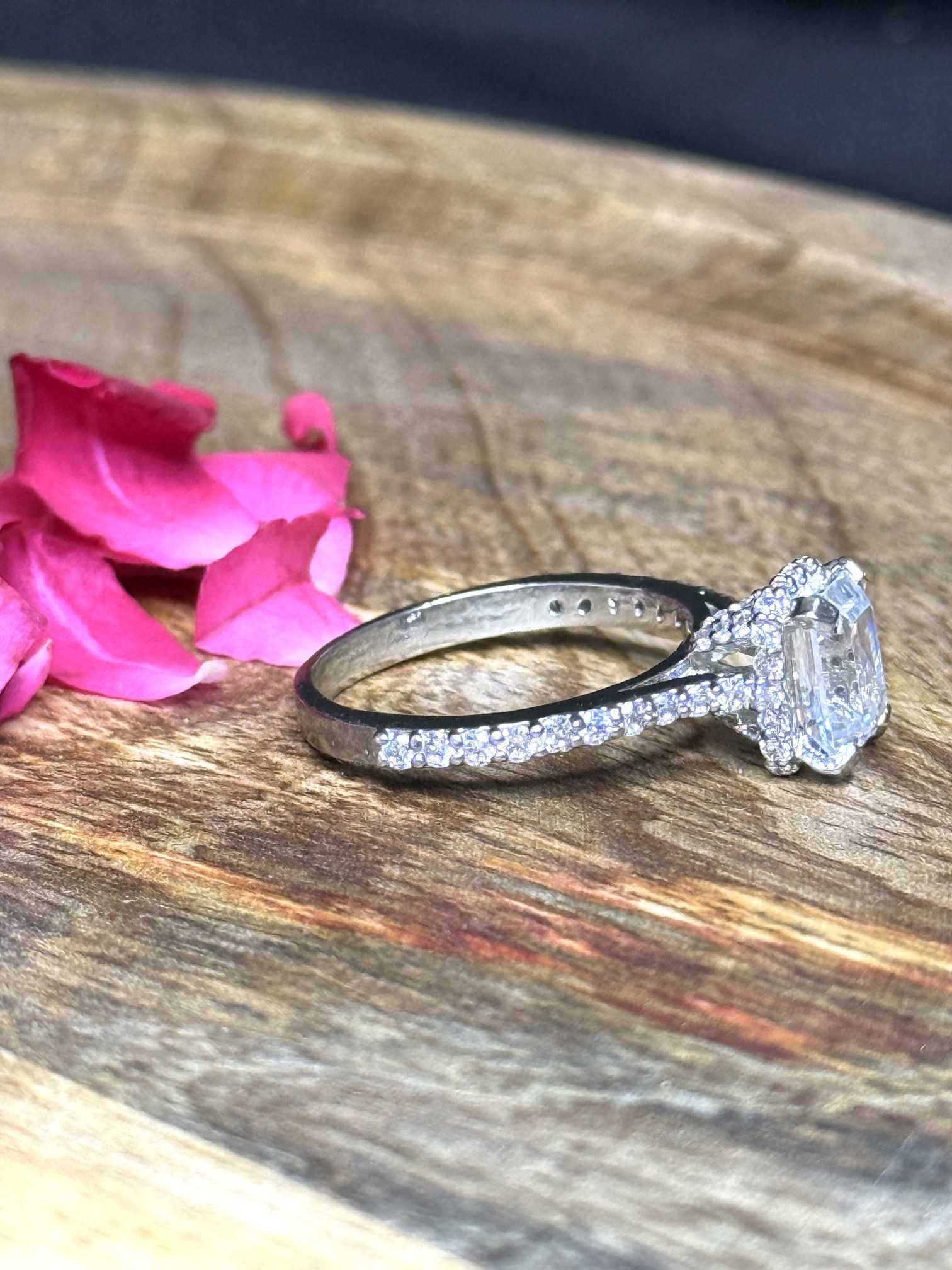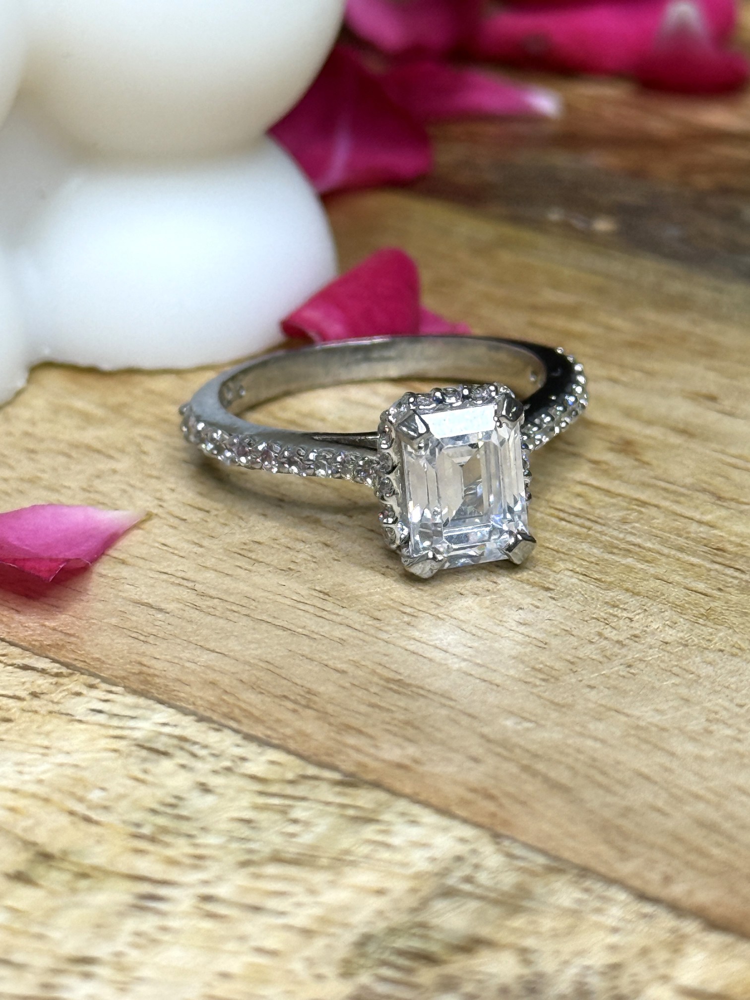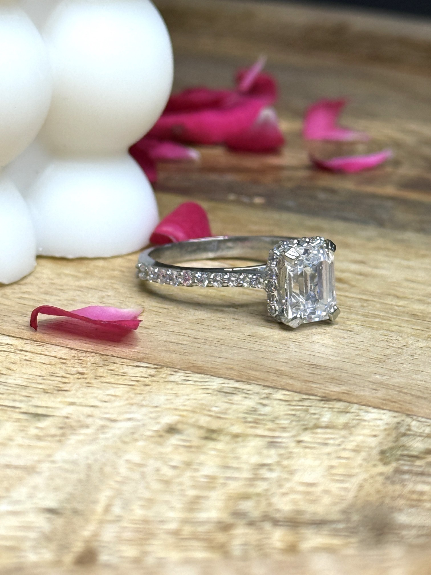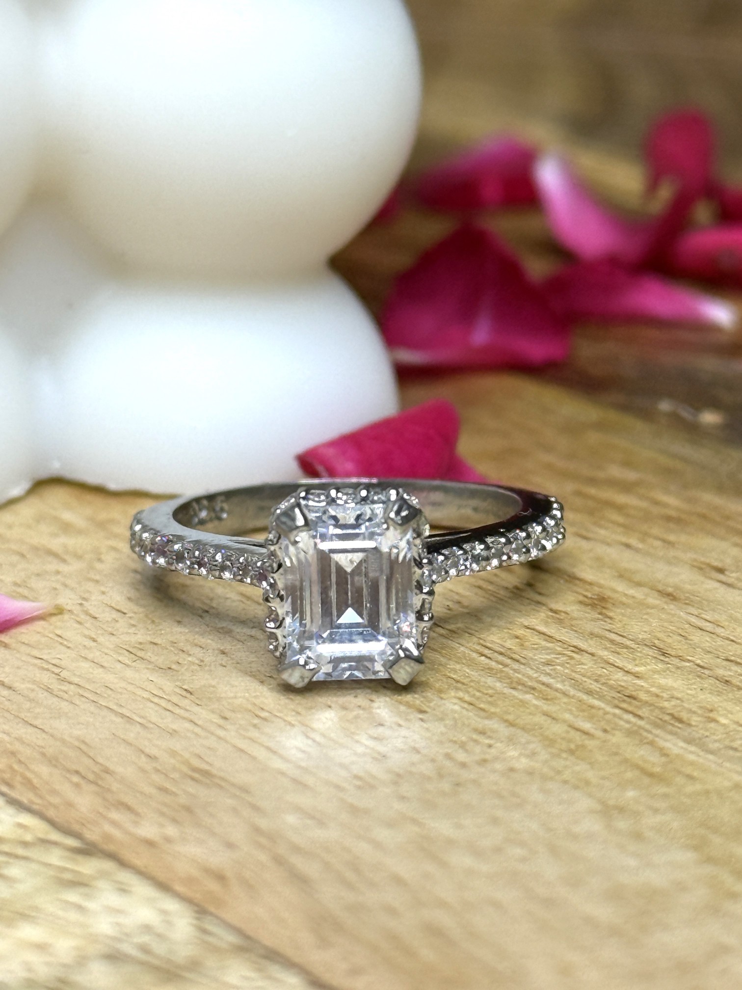 Expertly designed for those who appreciate perfection, the emerald-cut centerpiece is accentuated by a trail of sparkling CZ stones along the band. The raised prong setting enhances the brilliance of the gemstone, while the polished silver adds a mirror-like finish. With its impeccable craftsmanship, this ring exemplifies Fineryy’s dedication to detail, balance, and everlasting beauty.