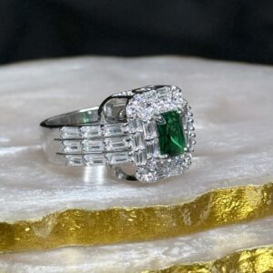 Step into elegance with the Emerald Green Centre CZ Ring In 925 Silver With White Finish—a true icon of refined luxury. Designed with a rich emerald-cut center stone in a deep green hue, this ring immediately captures attention. Set in high-quality 925 sterling silver and finished in a luminous white polish, it blends timeless grace with contemporary charm. Surrounding the bold green gem, a mix of baguette and round Cubic Zirconia stones adds brilliance and structure, making this piece unforgettable.