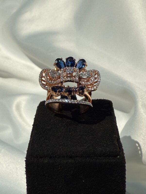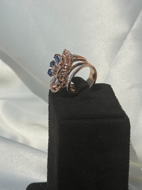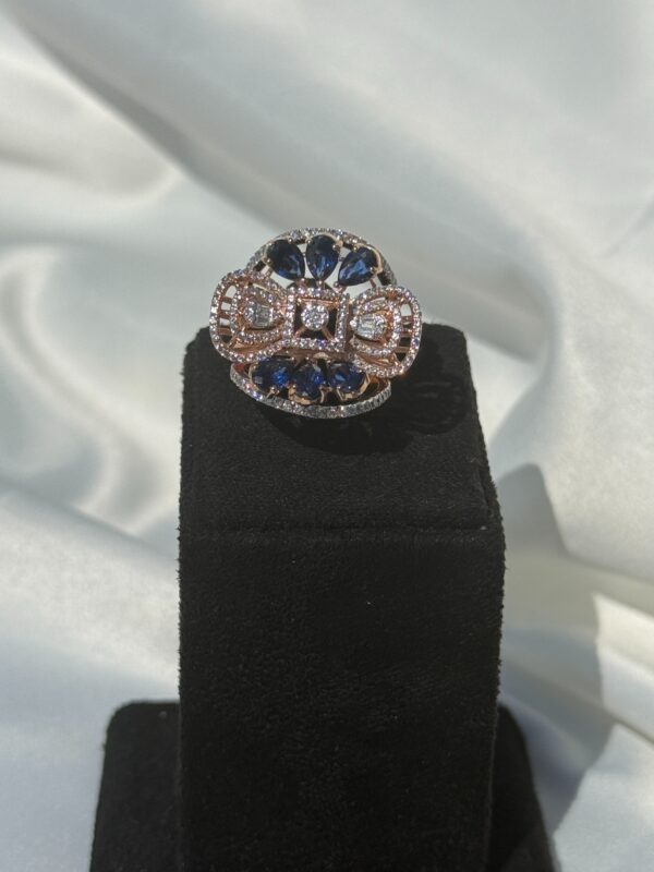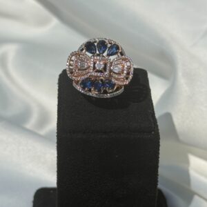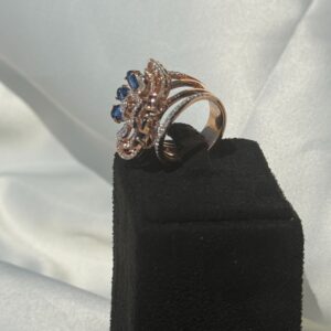 Unmistakably refined, the Exquisite 925 Sterling Silver Ring with Blue Sapphires and CZ Accents is design to leave a lasting impression. The luxurious rose gold-plated silver base serves as the perfect canvas for its striking composition. At its center lies a bow-inspired design, where deep blue sapphire stones are gracefully encircled by brilliant cubic zirconia. The interplay between shimmering accents and intense sapphire hues creates a visually captivating contrast. Carefully handcrafted, this ring reflects both elegance and superior technique. Whether chosen for an upscale event or styled with formal evening wear, it brings a sense of poise to any occasion.
