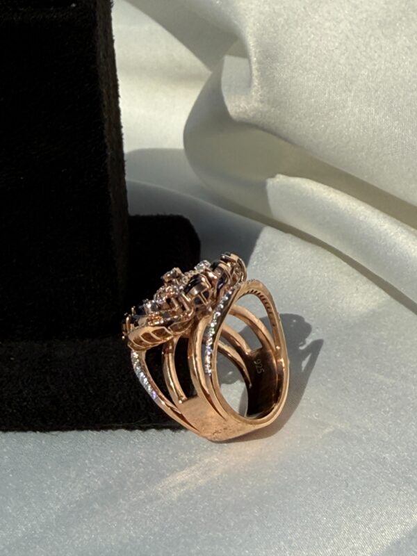 Delicately shaped and flawlessly finished, the Exquisite 925 Sterling Silver Ring with Blue Sapphires and CZ Accents exemplifies modern jewelry artistry. The bow motif not only adds visual interest but also symbolizes unity and elegance. Meanwhile, the sterling silver foundation—enhanced by a radiant rose gold polish—offers both durability and luxury. Because of its thoughtful design and polished curves, the ring rests comfortably on the hand, drawing admiration without overwhelming the ensemble. Moreover, the cubic zirconia accents, often mistaken for diamonds, add dimension and brilliance to this fine jewelry piece.