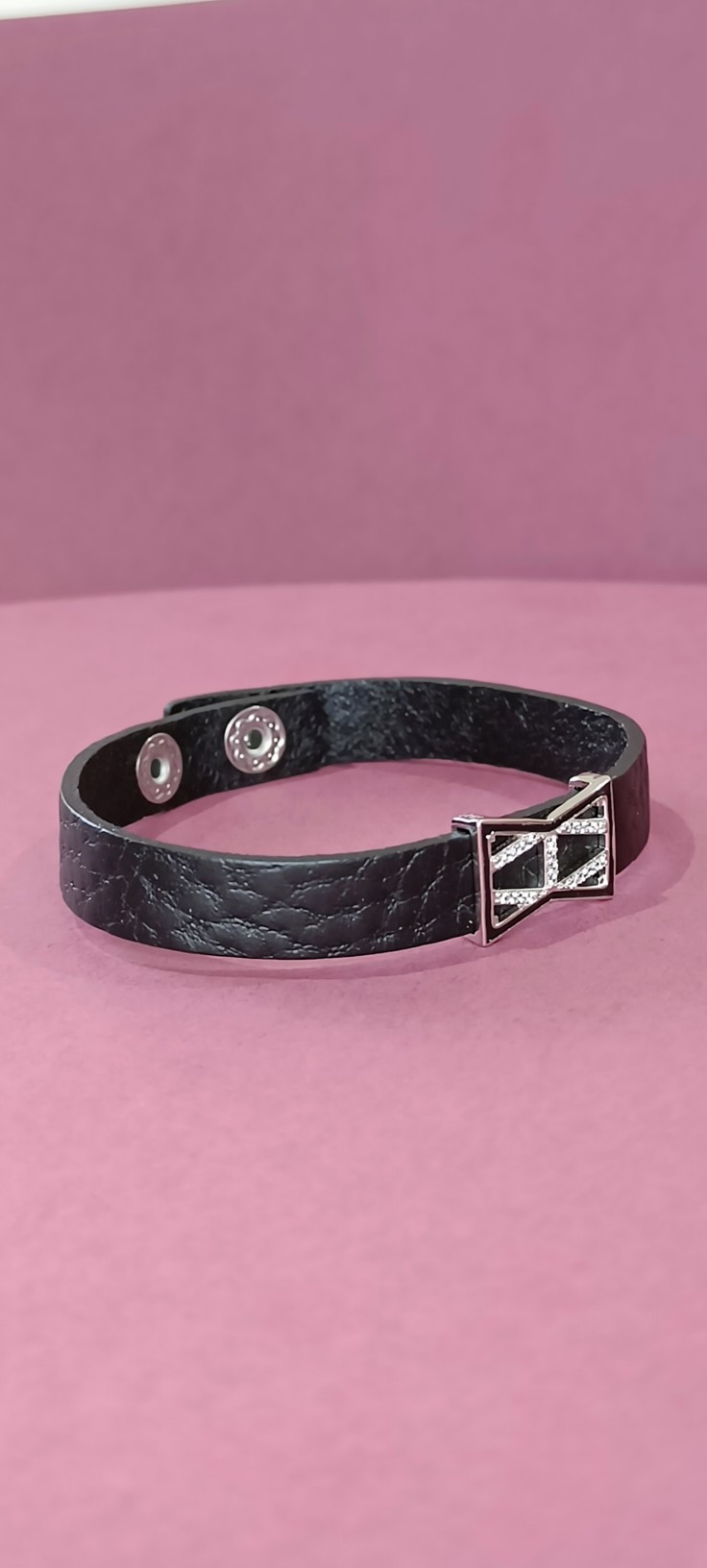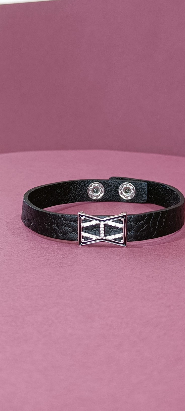 The bracelet’s sleek leather texture contrasts beautifully with the gleaming silver accent, symbolizing balance and grace. Its double snap-button clasp ensures both comfort and security, making it ideal for day-to-night wear. Designed for those who appreciate bold simplicity, this piece embodies contemporary sophistication.