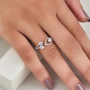 Its open, dual-ended structure symbolizes balance and beauty — one side featuring a luminous teardrop motif and the other graced with finely cut crystals, creating a unique harmony of sparkle and sophistication. Whether you’re dressing up for an event or adding elegance to your daily look, this ring makes an unforgettable statement of style.