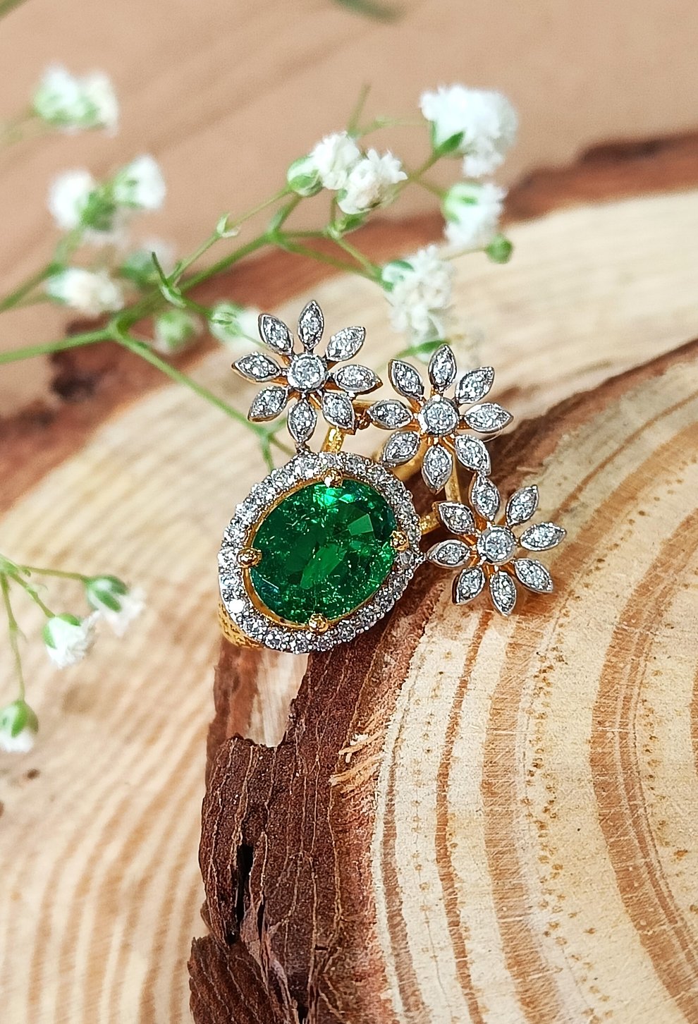 Perfect for occasional wear, this ring embodies sophistication with its vibrant lab-grown emerald centerpiece and floral accents. Its timeless design ensures it complements both casual and formal attire, effortlessly enhancing your style.