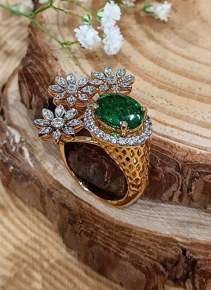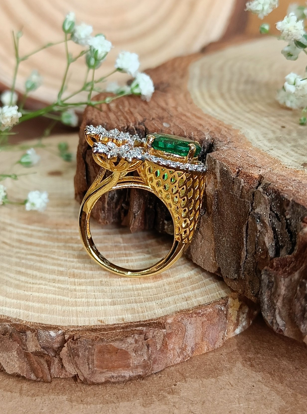 Introducing our exquisite lab-grown emerald ring, adorned with delicately crafted flowers on either side—a true must-have in your jewelry collection. This stunning piece is meticulously made in 925 sterling silver, polished with a luxurious yellow finish, adding a touch of elegance to any occasion.