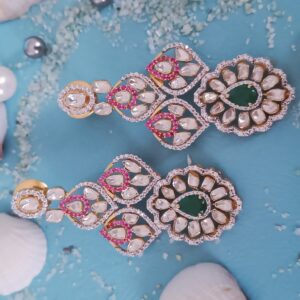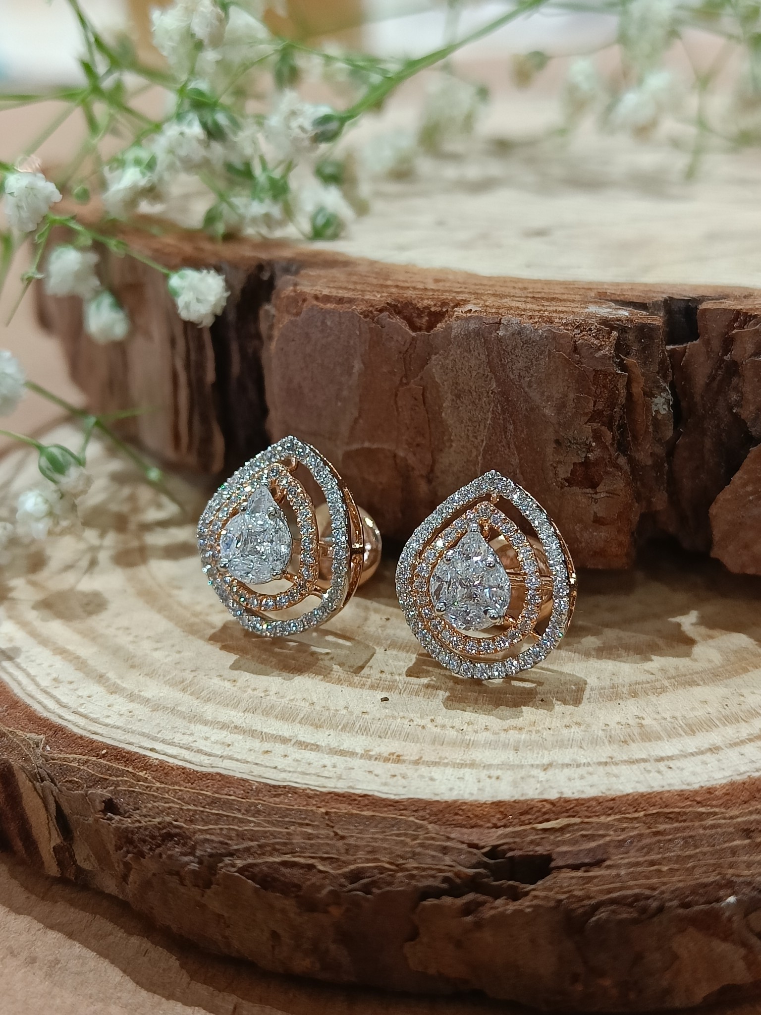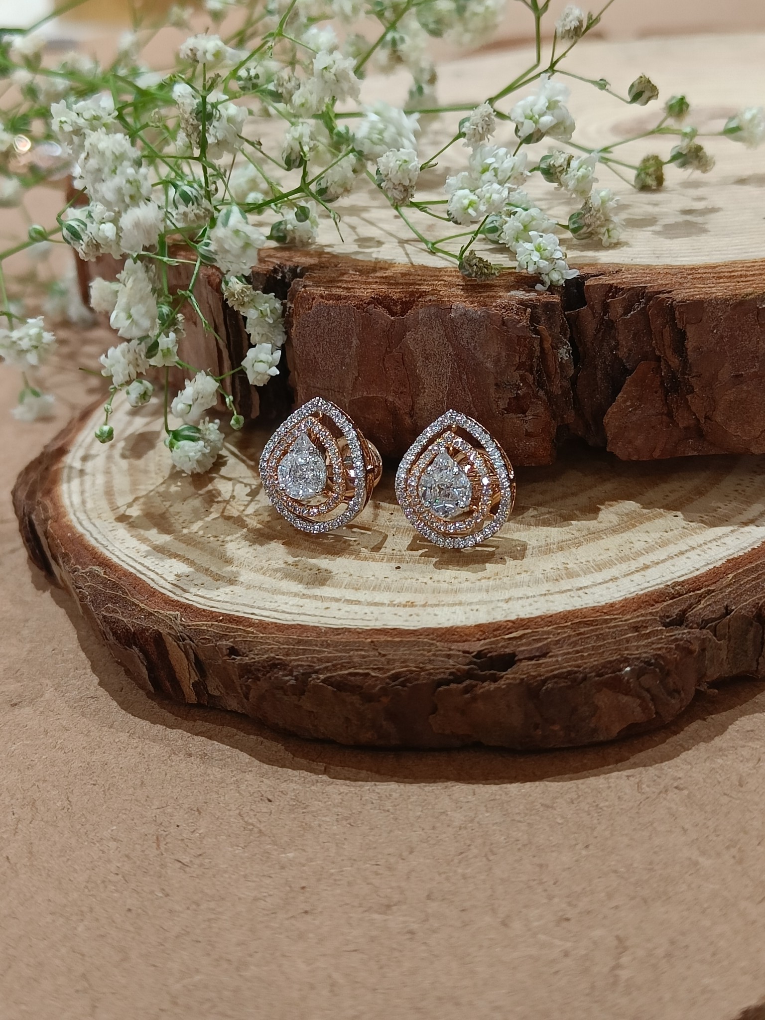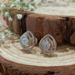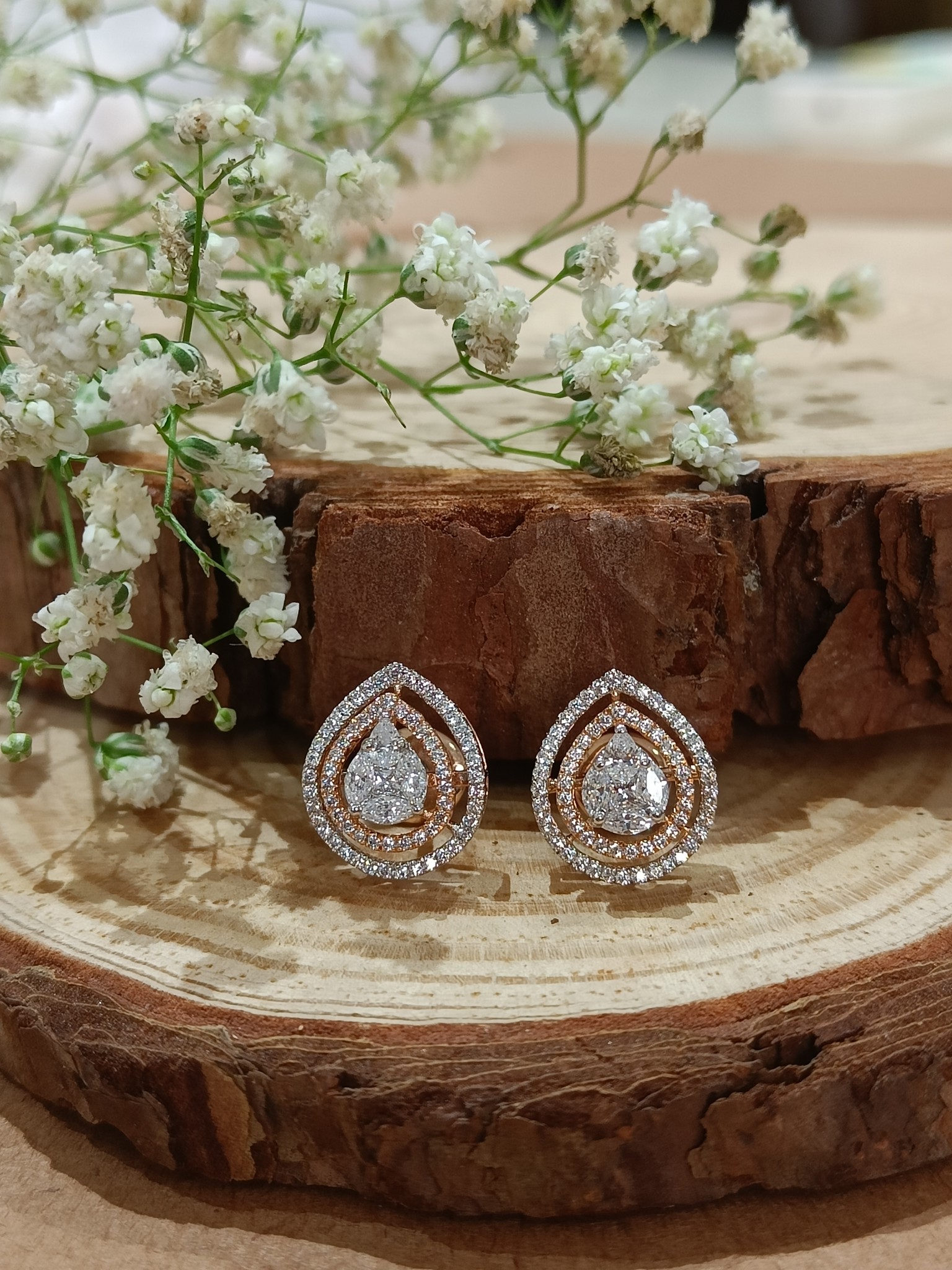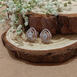 Each piece showcases layered halos of CZ stones, artistically arranged to give the illusion of a fully diamond-encrusted surface. The blend of silver and subtle rose-gold tones adds depth and luxury, making this set a stunning complement to both ethnic and western ensembles.