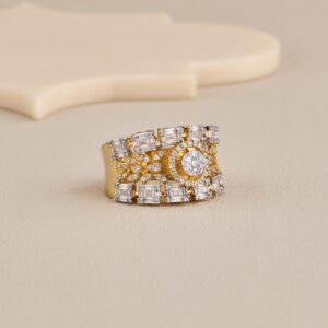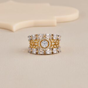 Statement Design: Features a central solitaire embraced by baguette-cut stones that create a regal, structured aesthetic.