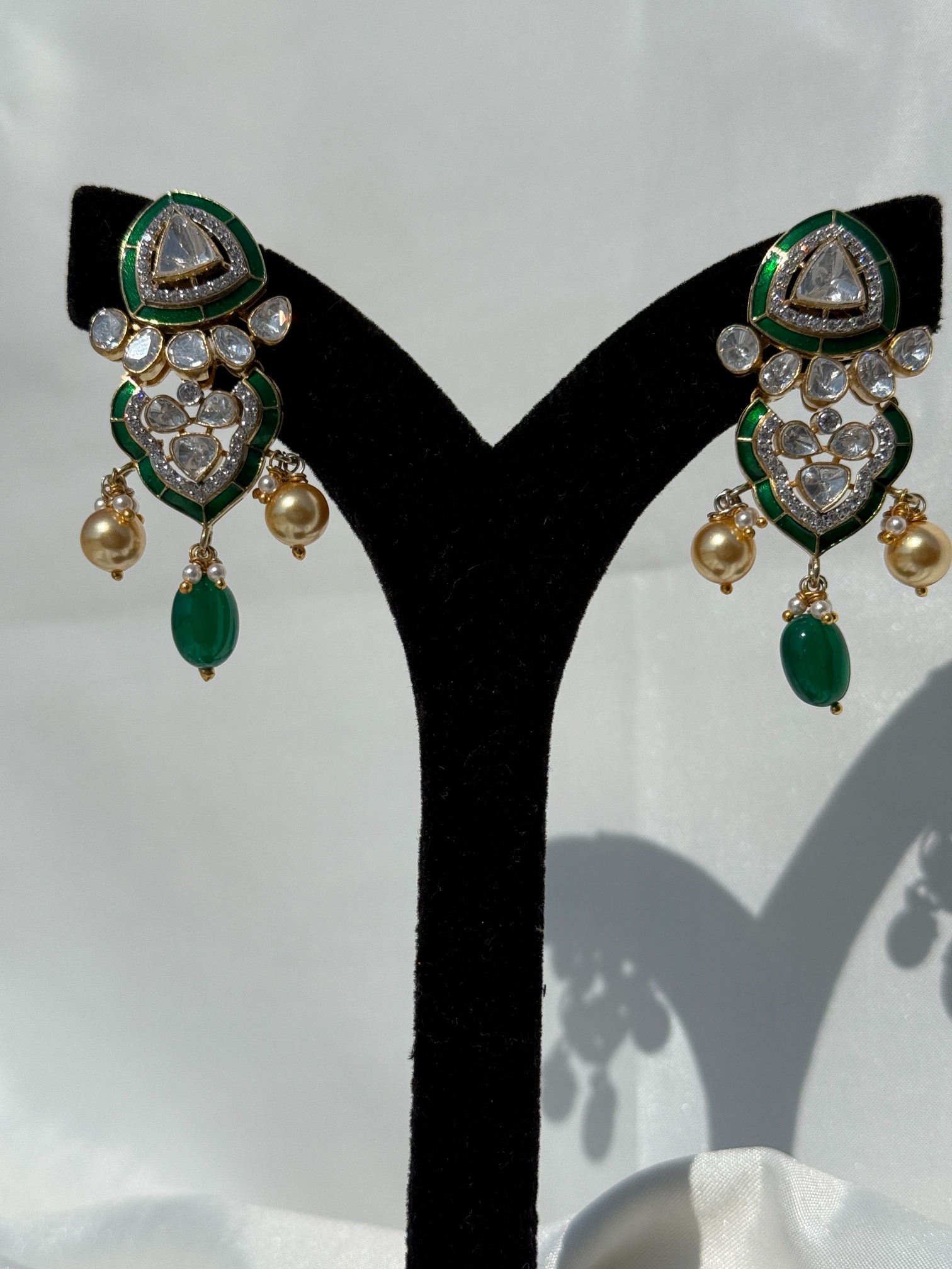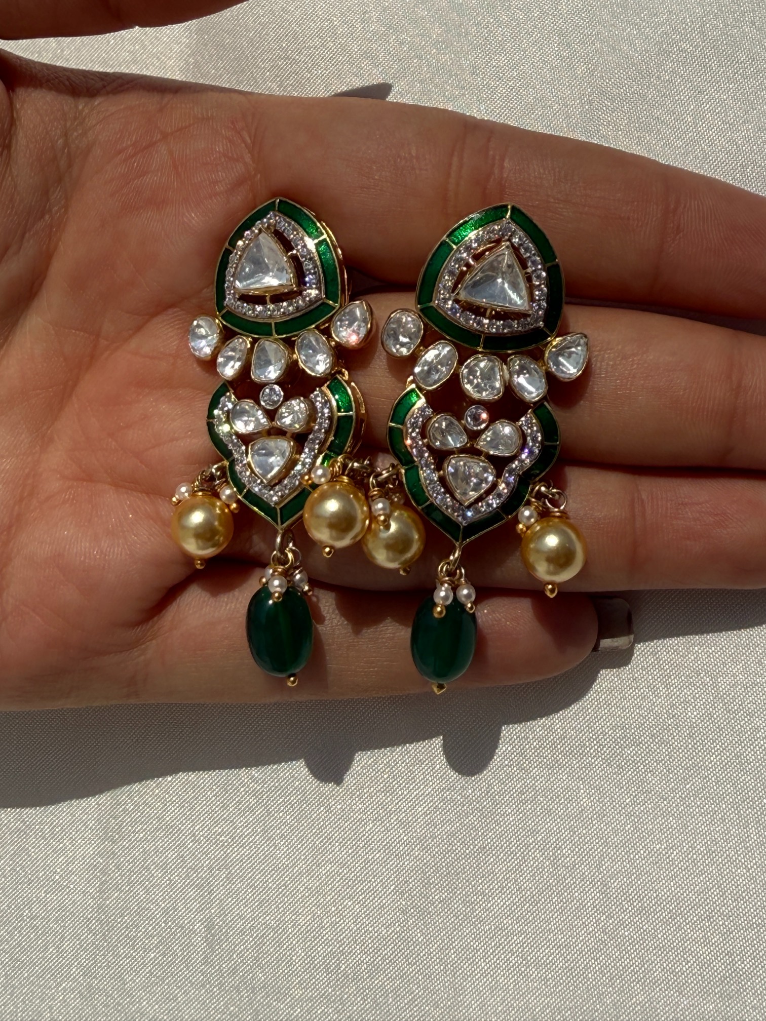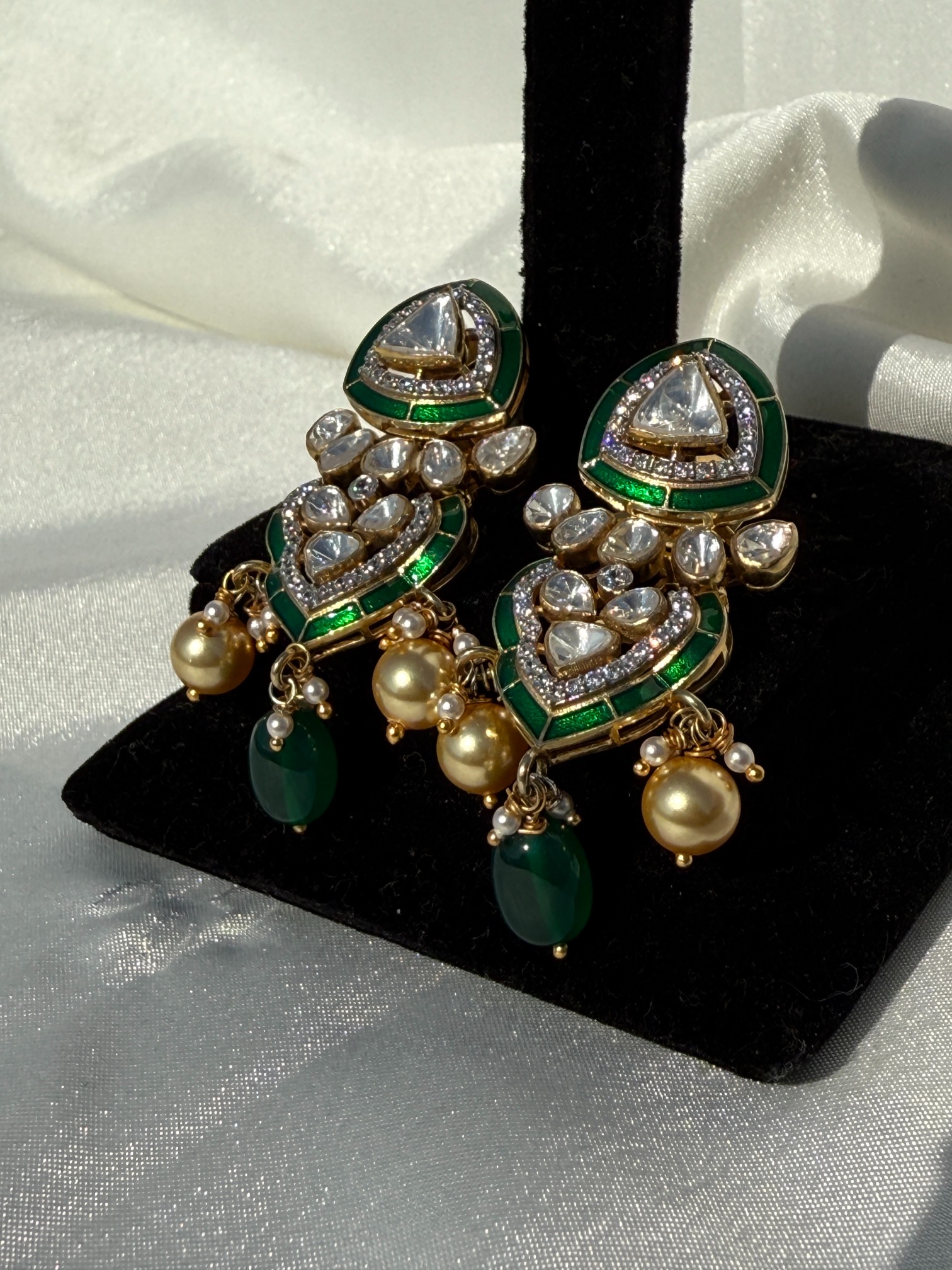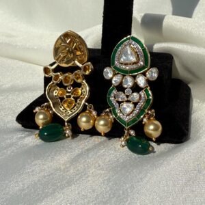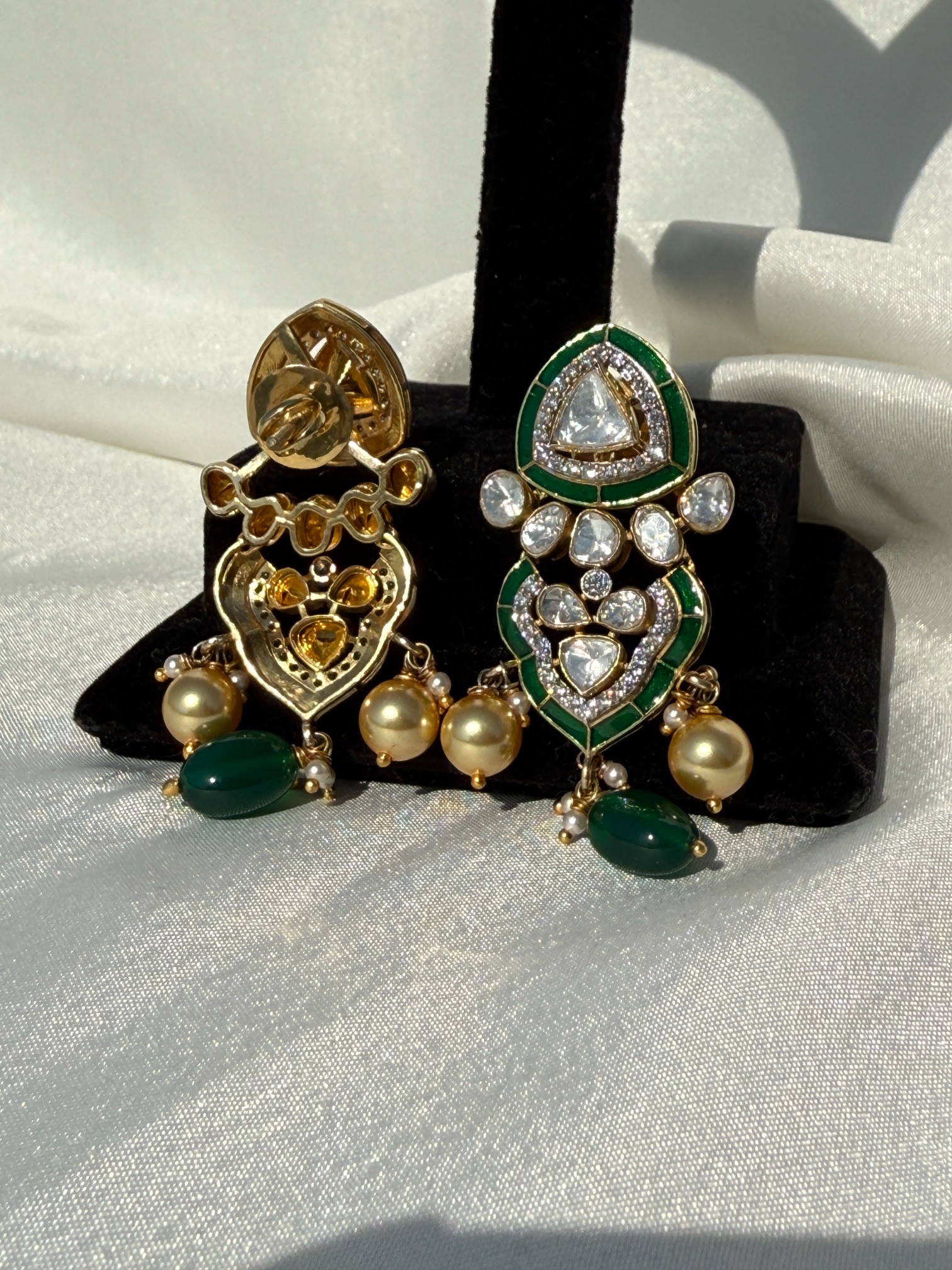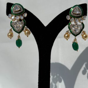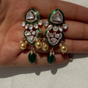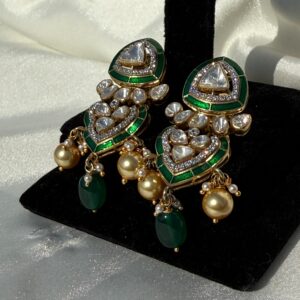 Inspired By Traditional Heritage Jewelry, These Exquisite Dangler Earrings Showcase An Opulent Combination Of Kundan Stones, Rich Green Enamel Detailing, And Lustrous Pearl Drops. Crafted With Precision, The Intricate Design Features A Regal Motif With Shimmering Uncut Stones Set In A Gold-Tone Finish, Exuding An Air Of Sophistication. The Teardrop Emerald-Green Beads Add A Touch Of Vibrancy, Making Them A Perfect Statement Piece For Weddings, Festive Occasions, Or Special Events. This Earring Has Screw Back.