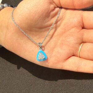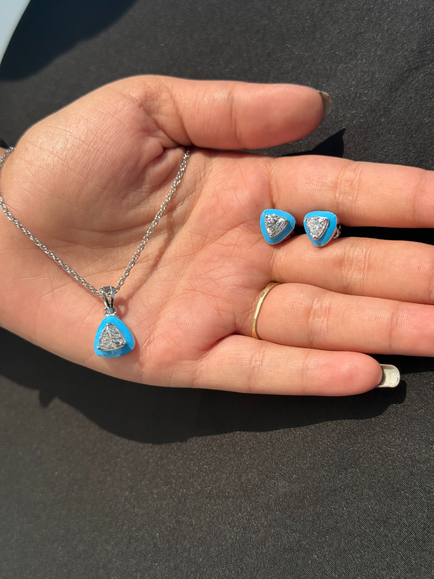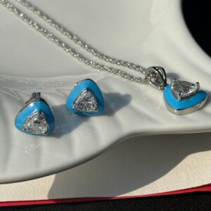 Designed for those who love modern elegance, the Turquoise Enamel & Trillion-Cut Zirconia Silver Jewelry Set showcases a refreshing pop of color and radiant sparkle. Crafted with care using 925 sterling silver, each piece is finish with a rich layer of turquoise blue enamel sterling silver jewelry set, giving the set a vibrant and fresh look. The trillion-cut zirconia stones, carefully set by skilled artisans, add a sophisticated brilliance that complements the enamel’s playful charm. This jewelry set combines contemporary design with timeless allure, making it suitable for both everyday wear and special occasions .Subtle details, like the smooth silver finish and clean-cut settings, make this ensemble a smart investment for anyone seeking quality with style.