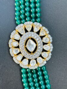 Fittingly The Necklace Combines Green Beads With Polki Diamonds To Balance Wealth And Subtlety. The Necklace Serves A Mark Of The Tradition But Remains On Point Of Trend For Modern Women. It Is Effortless To Go With Indian Traditional Dresses Or Fusion Wear And Immediately Enhances The Attire Without Excessive Heavy Jewelry.